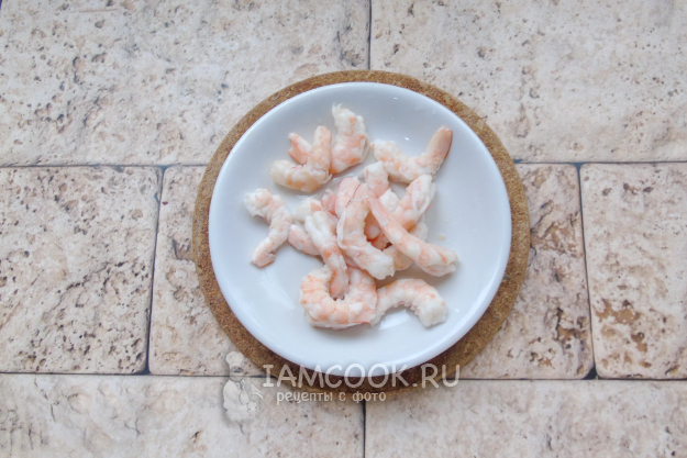 А тем временем варено-мороженые креветки залейте кипятком на 10 минут. Затем удалите голову, панцирь и кишечную вену.