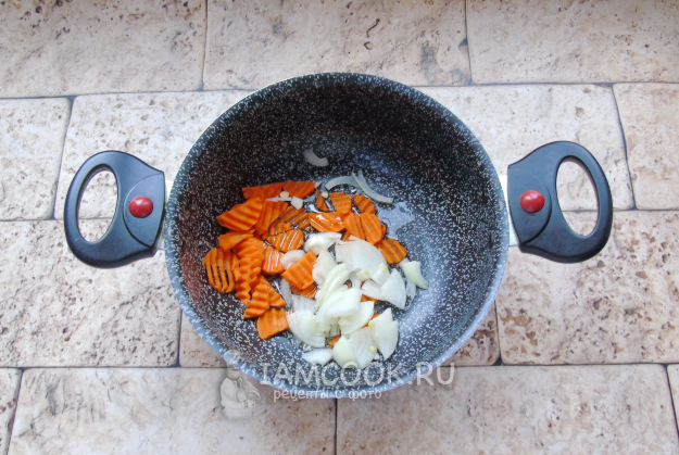 Морковь и репчатый лук очистите, помойте. Нарежьте произвольно. Выложите в кастрюлю с антипригарным покрытием. Налейте растительное масло.