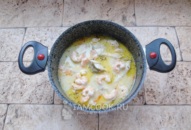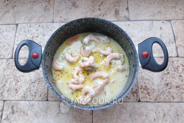 Выложите креветки в кастрюлю с судаком.