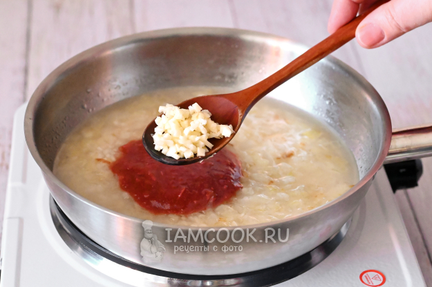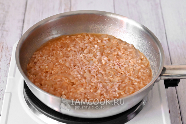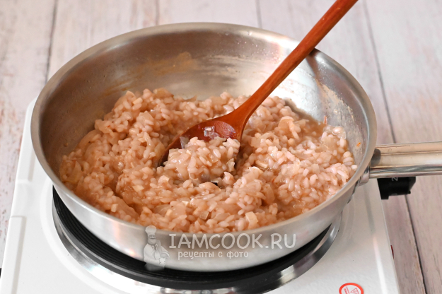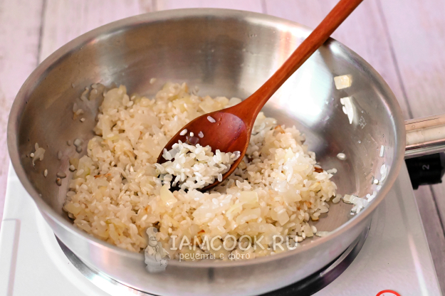 Затем всыпьте сухой рис и продолжайте обжаривать его вместе с луком ещё около минуты, постоянно помешивая, чтобы рис впитал масло и луковый аромат.