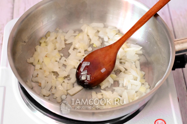 Разогрейте сковороду с маслом и обжарьте на среднем огне нарезанный лук до золотистого цвета (около 5 минут).