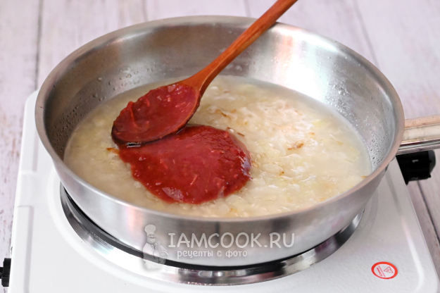 Далее влейте воду, посолите по вкусу и добавьте пару ложек ткемали. Соус уже содержит какое-то количество соли, поэтому не пересолите.
