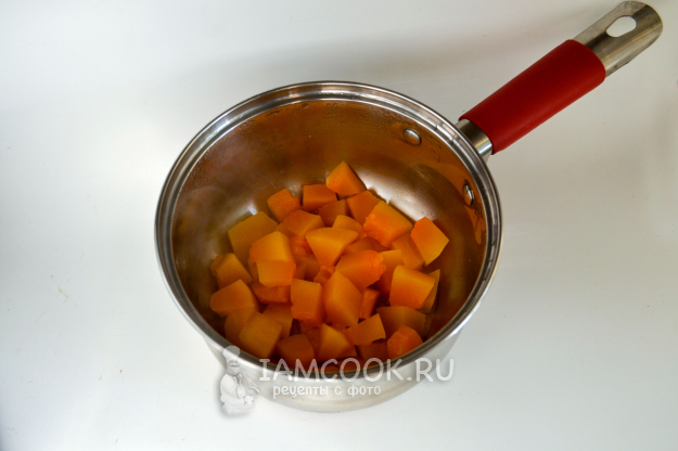 Тыкву очистите от кожуры и семечек. Мякоть тыквы нарежьте кусочками, положите в сотейник, влейте воду, чтобы только прикрыла кусочки, и сварите до мягкости. Лишнюю жидкость с тыквы слейте.