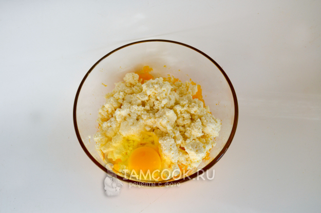 Добавьте к тыквенному пюре творог, разбейте яйцо, щепотку соли. Тщательно перемешайте творог с яйцом и пюре.