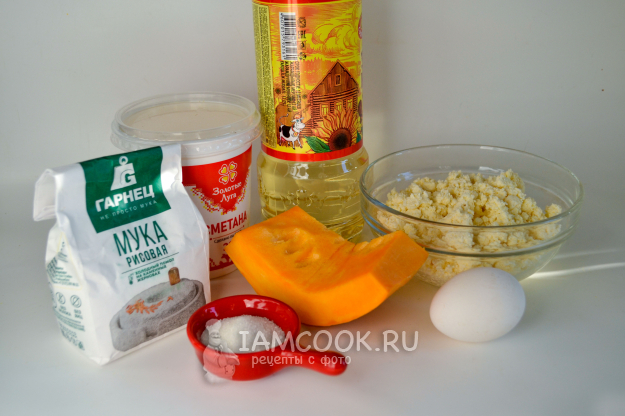 Соберите продукты для приготовления сырников с тыквой и рисовой мукой. Творог лучше использовать сухой. Если творог влажный, то заранее положите его в дуршлаг, чтобы стекла сыворотка.