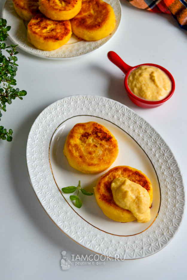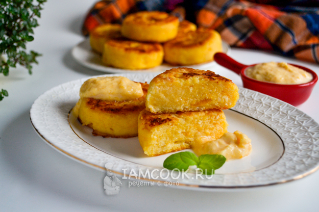 На стол сырники с тыквой и рисовой мукой подавайте горячими или теплыми с тыквенным соусом.