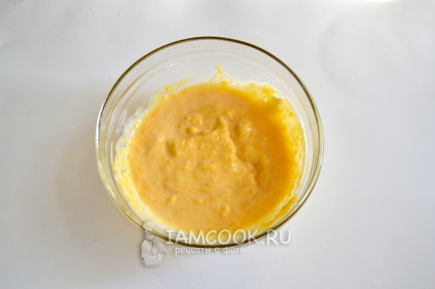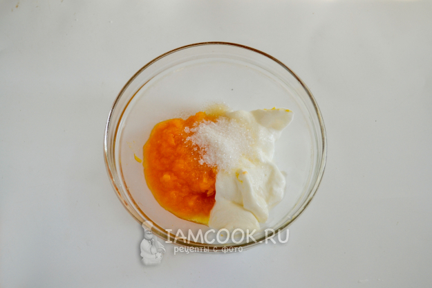 Пока сырники жарятся, приготовьте соус. Возьмите пару ложек тыквенного пюре, пару ложек сметаны и сахар по вкусу.