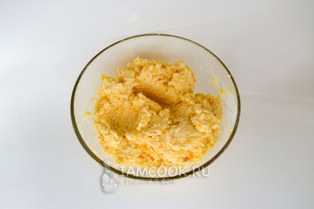 Количество муки может немного отличаться от указанного в рецептуре и зависит от влажности творога и сочности тыквы. Перемешайте. Должно получиться густое тесто, из которого можно сформовать сырники.