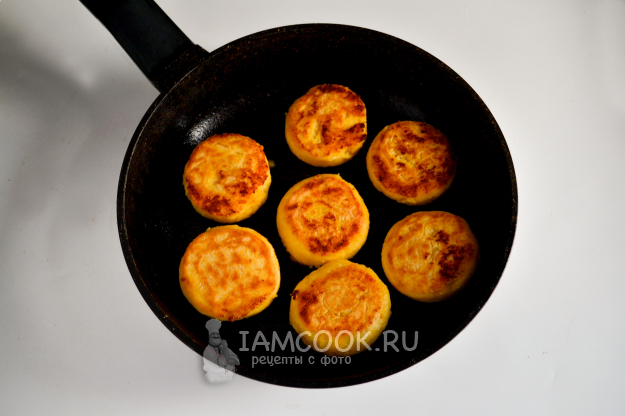 Когда нижняя сторона сырников будет румяной, аккуратно переверните. И так же под крышкой продолжайте жарить сырники до румяности.