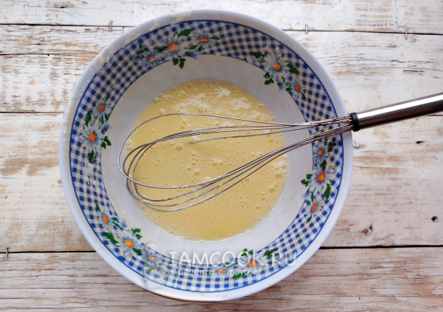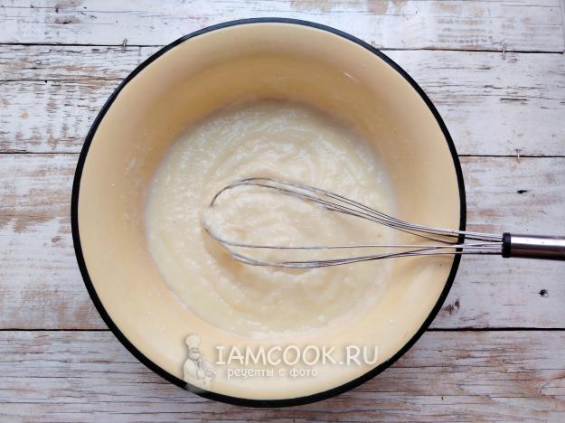 Молочную смесь тонкой струйкой перелить в посуду с яичной, одновременно перемешивая ее ложкой, чтобы содержимое не свернулось.