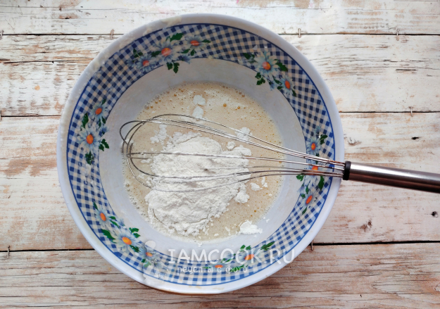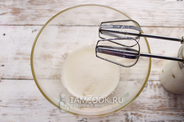 Венчиком растереть смесь до побеления. Всыпать крахмал, еще раз все перемешать.