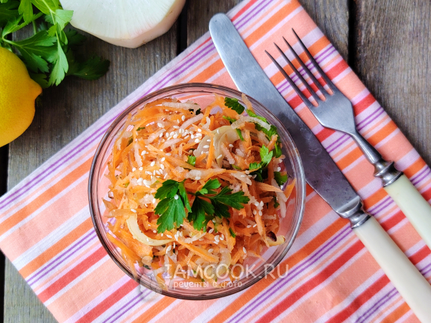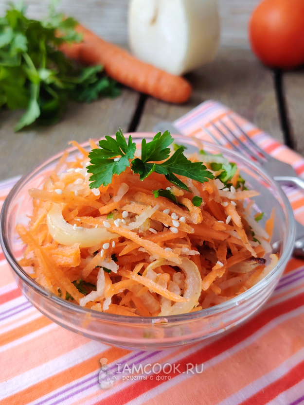 Можно по вкусу сдобрить салат рубленой свежей зеленью, например, петрушкой. Она придаст блюду дополнительный приятный аромат. Добавить масло. Перемешать, и салат из дайкона с жареным луком можно подавать к столу, а можно дать ему постоять в холодильнике - овощи слегка промаринуются и вкус станет еще насыщеннее.