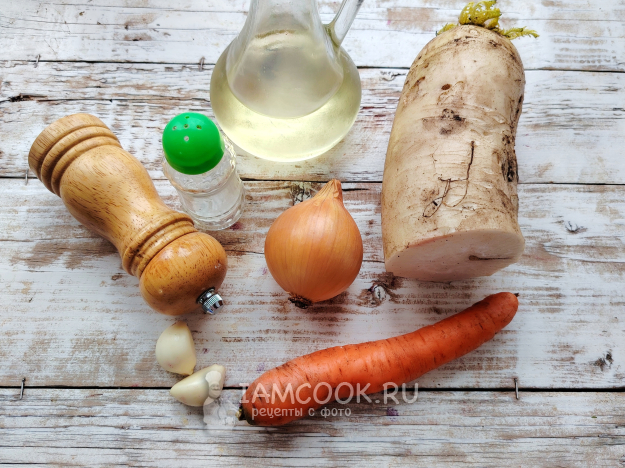 Собрать продукты по списку. Салат из дайкона с жареным луком можно готовить в любое время года, свежие овощи можно приобрести даже зимой, главное, чтобы они были сочными и вкусными.