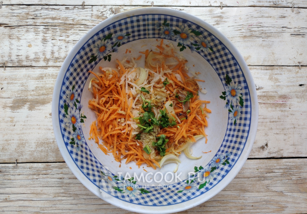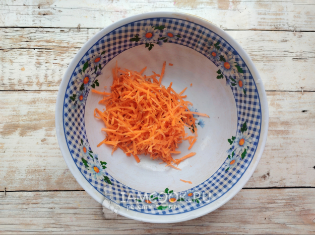 Морковь почистить, натереть на терке для корейской морковки или на обычной терке с крупной ячейкой.