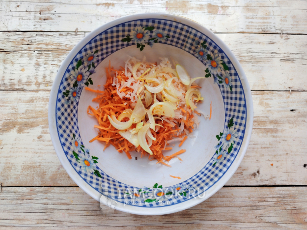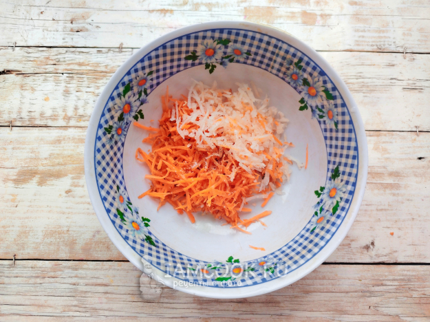 Дайкон следует судьбе моркови. Чеснок можно пропустить через пресс или натереть на терке с мелкой ячейкой.