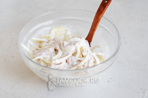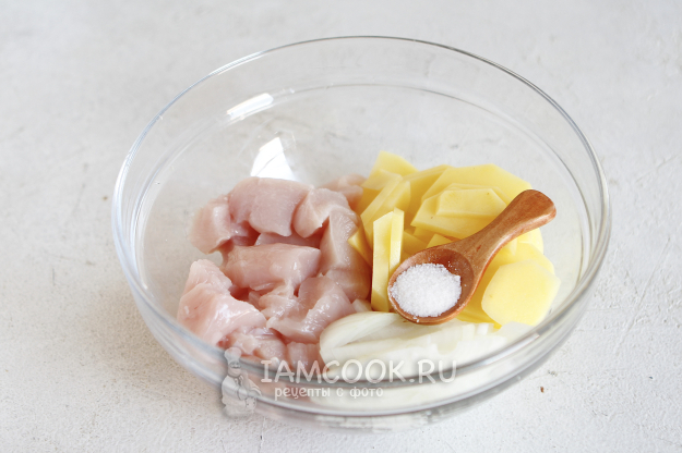 Переложите филе курицы и овощи в глубокую чашу. Посолите. Так как я готовила блюдо для деток, то больше никакие специи не стала добавлять. Вы ориентируйтесь на свои вкусовые предпочтения.