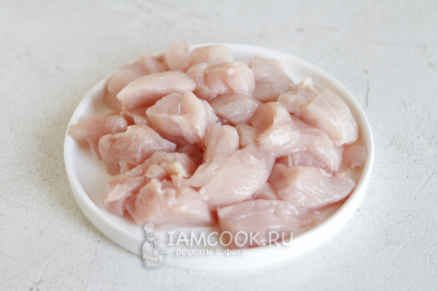Куриное филе промойте и обсушите бумажным полотенцем. Нарежьте на кусочки 1.5х1.5 см.