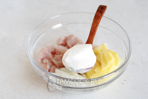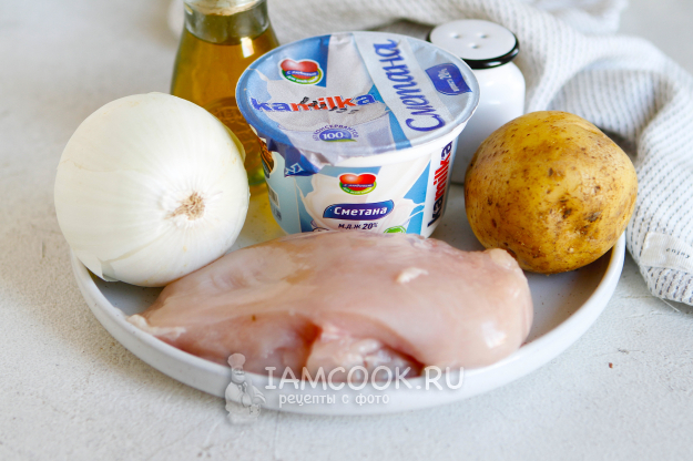 Соберите все необходимые продукты по списку и приступим к приготовлению картошки с курицей в мультиварке со сметаной.