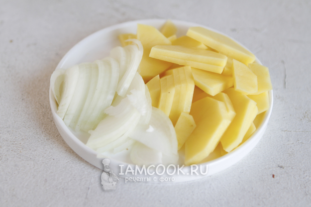 Лук нарежьте полукольцами, а картофель - произвольно.