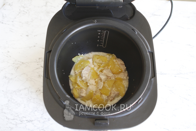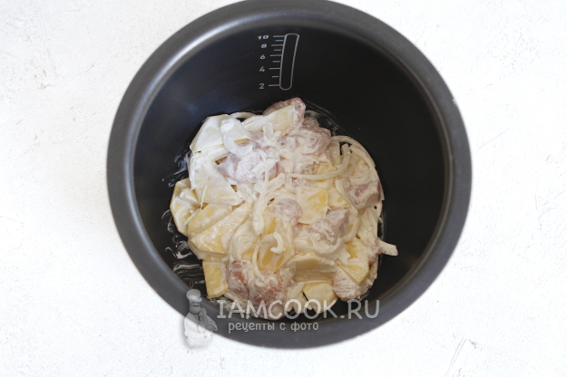 Выставляем режим "Тушение", время приготовления картошки с курицей в мультиварке со сметаной - 35-40 минут.