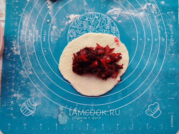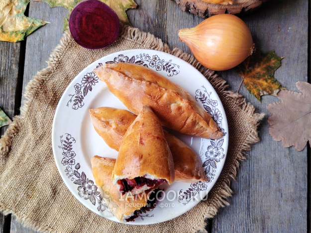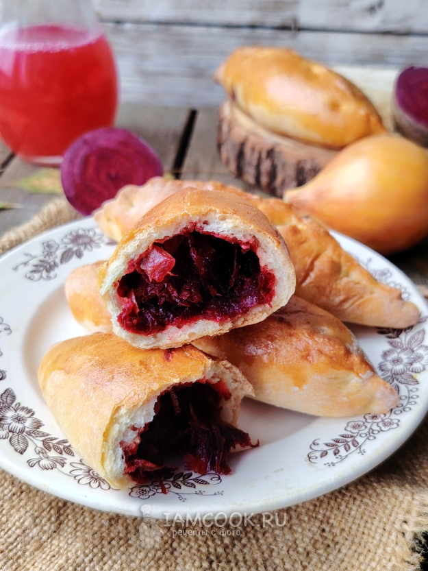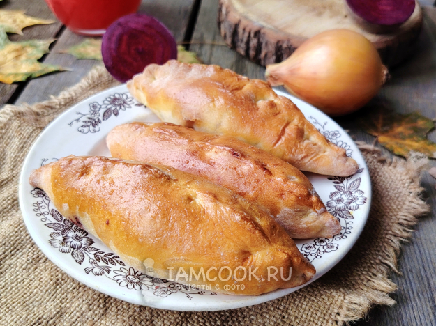 Скрепить края пирожков. Выложить их на противень, застеленный пергаментом, смазать взбитым яйцом, выпекать пирожки со свеклой в духовке при 180 градусах около 35 минут.