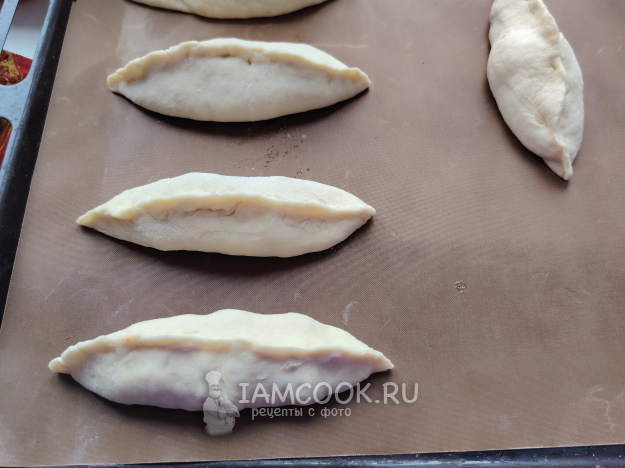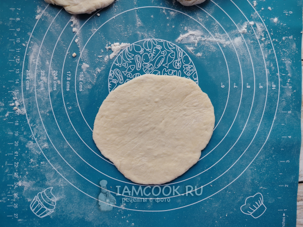 Готовое тесто разделить на кусочки, раскатать каждый в круглый пласт.