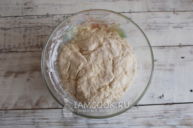 Продолжить замес можно руками на рабочей поверхности, когда тесто значительно загустеет. Затем снова поместить его в миску и оставить на пару часов возле батареи. Миску нужно затянуть пленкой сверху или прикрыть полотенцем, чтобы тесто не покрылось сухой корочкой. За это время пару раз необходимо обмять дрожжевое тесто.