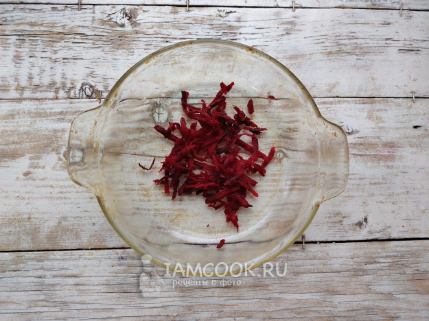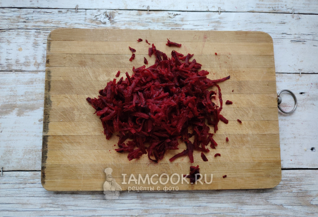 Свеклу почистить, натереть на терке с крупной ячейкой или мелко нарезать ножом.