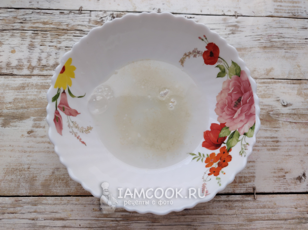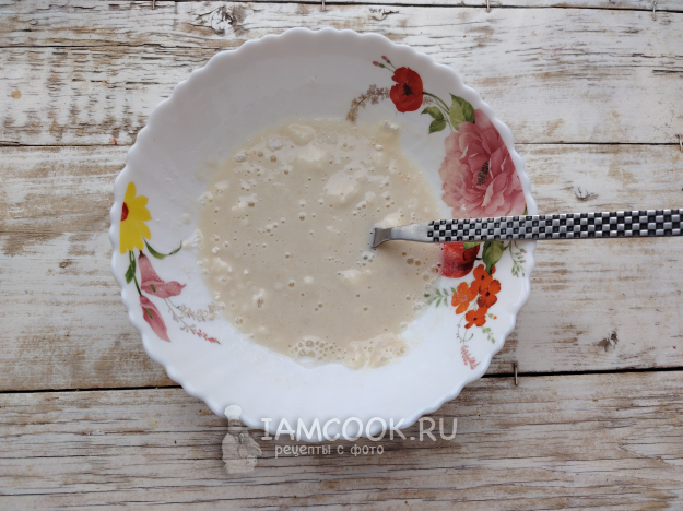 В глубокую посуду влить теплую воду, растворить сахар, добавить ложку пшеничной муки и дрожжи, размешать, оставить на 15 минут на столе.