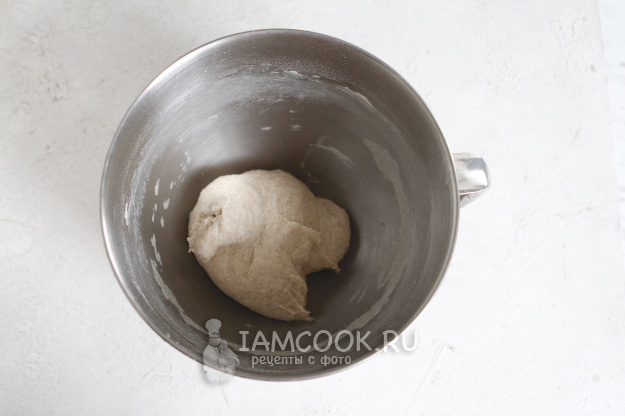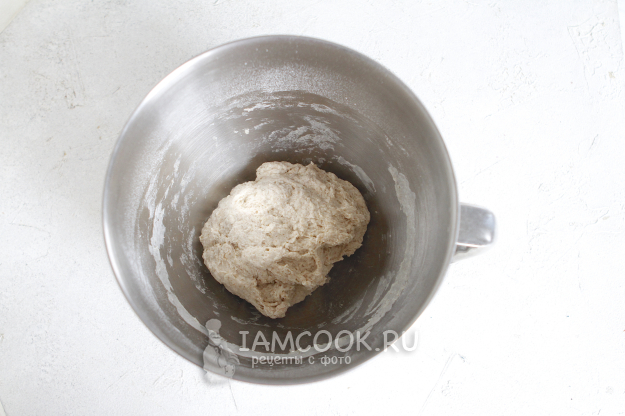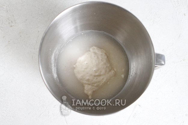Установите насадку крюк. На 1-2 скорости вашего миксера начните замес. Долго не стоит вымешивать. Как только увлажнится мука, выключаем миксер и оставляем тесто на аутолиз на 30 минут.