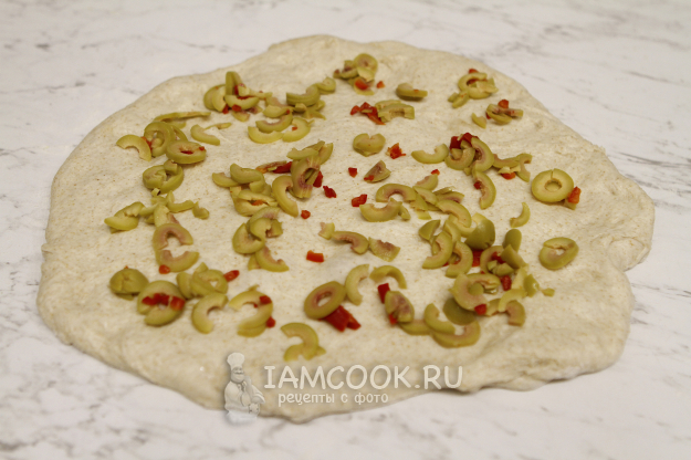 Подготовьте оливки, нарежьте их (у меня были оливки с перцем чили). Тесто слегка растяните и выложите оливки. Количество оливок я указала приблизительное, можно добавить больше.