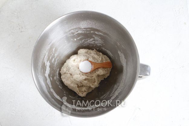 Через указанное время добавьте соль и хорошо вымесите тесто.
