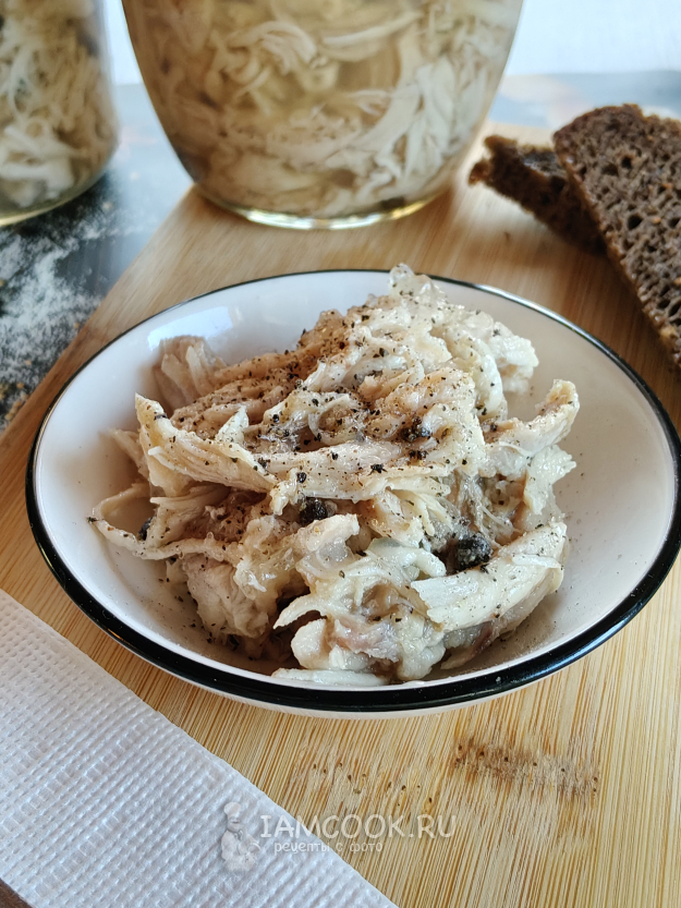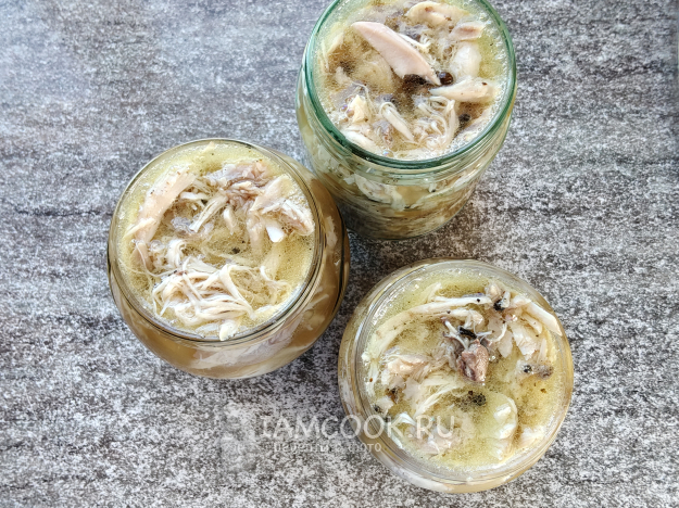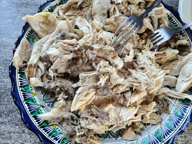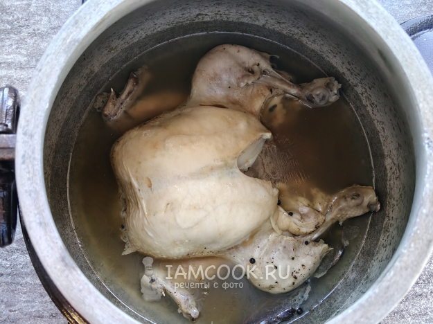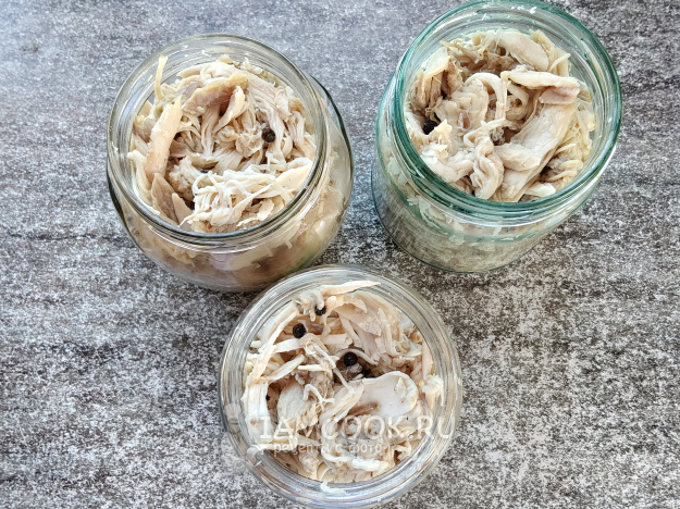 Тушку курицы можно сразу отделить от костей, и положить в казан только мясо, а после раскладывать черпаком сразу в банки. Я решила сварить тушку целиком, а потом разобрать.