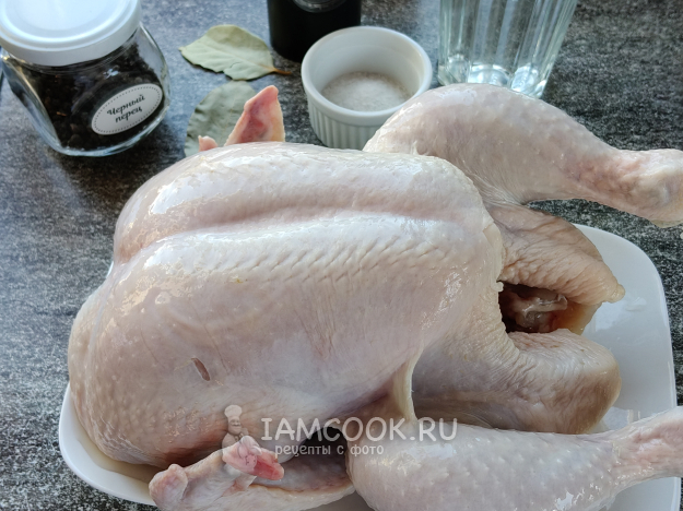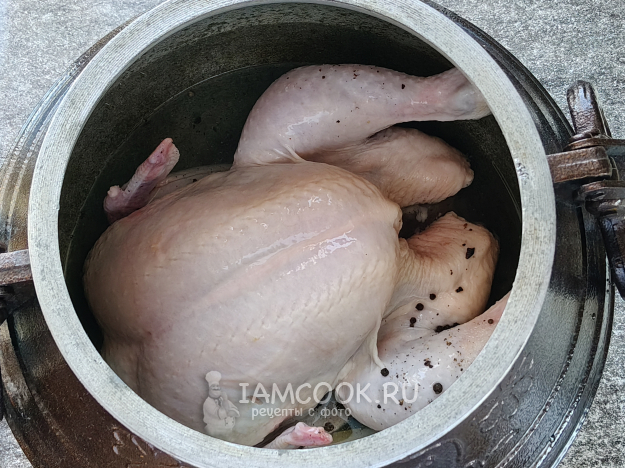 Положить курицу в казан, добавить соль, перец горошком, молотый и лавр. Залить водой.