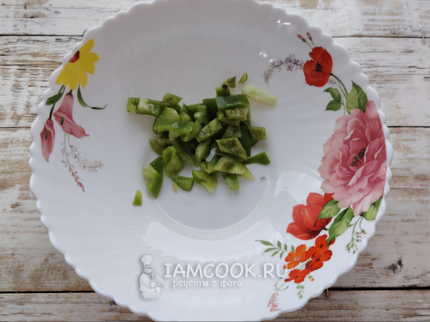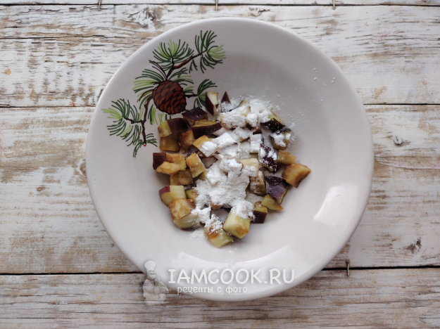 Овощи промыть. Баклажан нарезать кубиками, поместить в миску, посыпать солью, оставить на 15 минут, затем промыть овощную нарезку, жидкость отжать. Присыпать крахмалом. Перемешать.