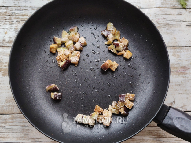 Обжарить на разогретом масле баклажанные кубики в кляре. Во время жарки добавить в сковороду соль и перец, перемешать.