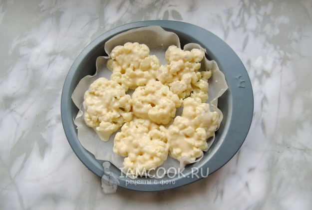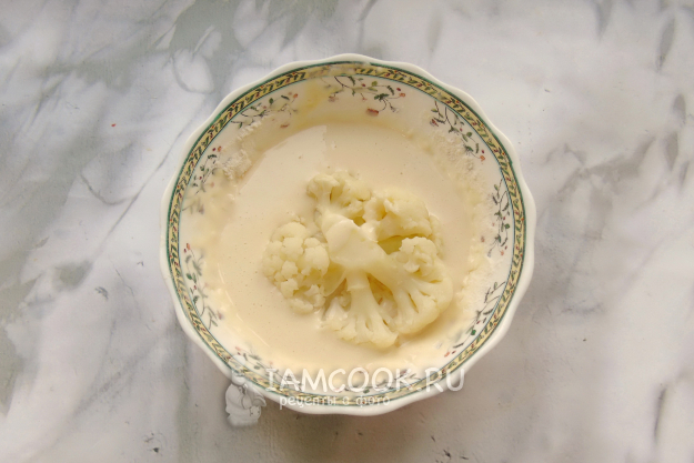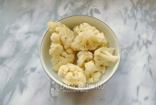 Цветную капусту разберите на соцветия, выложите в кастрюлю и залейте водой, посолите по вкусу. Доведите до кипения и варите 7-8 минут. Капуста должна быть достаточно мягкой, чтобы её можно было отбить, но и не разваливаться.