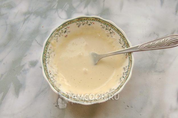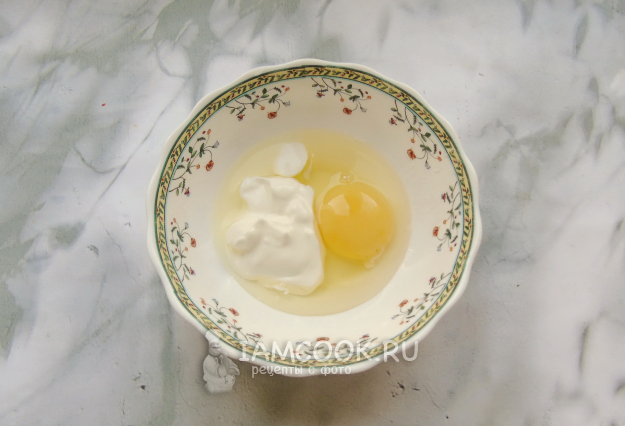 Приготовьте кляр. В мисочку разбейте яйца, добавьте сметану. Немного посолите и взбейте.