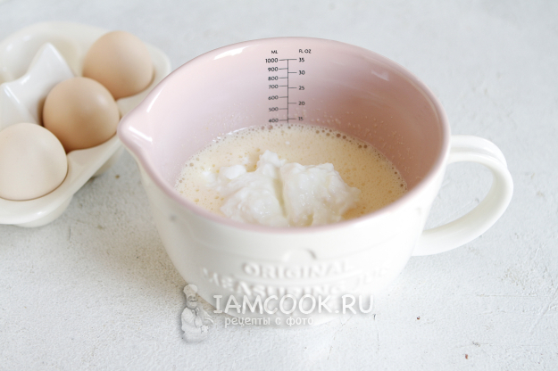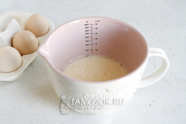 Разбейте в чашу для взбивания два яйца. Добавьте сахар. Взбейте яйца с сахаром до пышной пены.