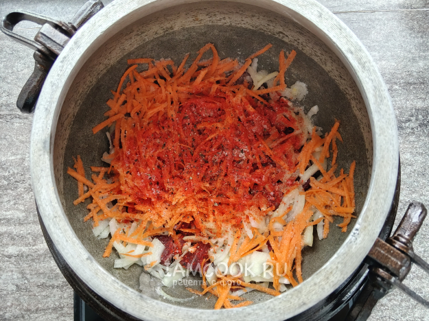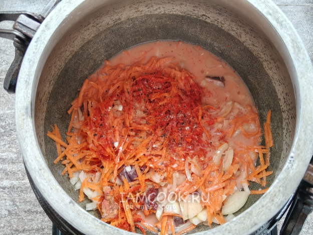 В воду добавить сметану, томат и муку. Тщательно перемешать.