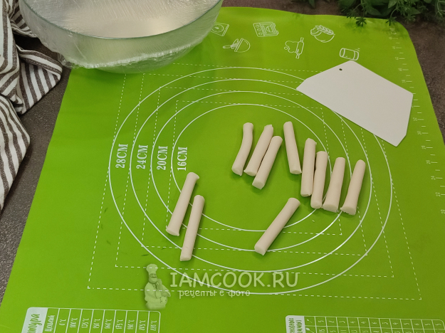 Формуем токпокки (кастрюлю с водой для варки можно уже ставить на плиту). Тесто довольно быстро сохнет, поэтому не забывайте накрывать пленкой то тесто, с которым в данный момент не работаете. Отщипываем от теста небольшие кусочки, раскатываем в колбаску. Сначала ладонями, затем, чтобы они были ровными, округлыми, раскатываем при помощи шпателя для теста. На вкус "ровность" рисовых палочек не повлияет, можно и просто руками раскатывать).