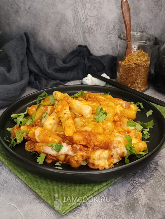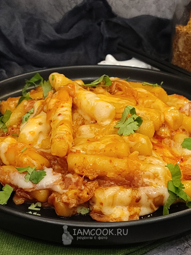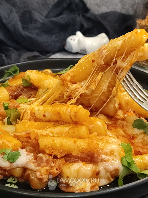 Подавайте домашние токпокки сразу, пока они еще горячие, пока тянется сыр.