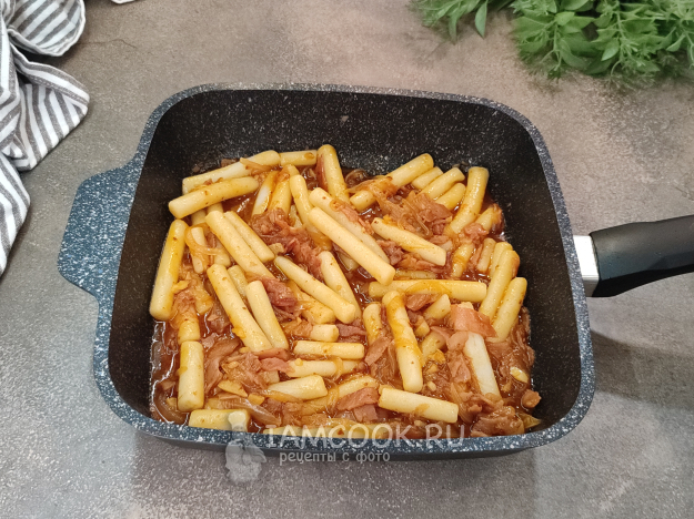 Выложите токпокки в соус, перемешайте, прогрейте все пару минут. Токпокки напитаются вкусами и ароматами соуса.