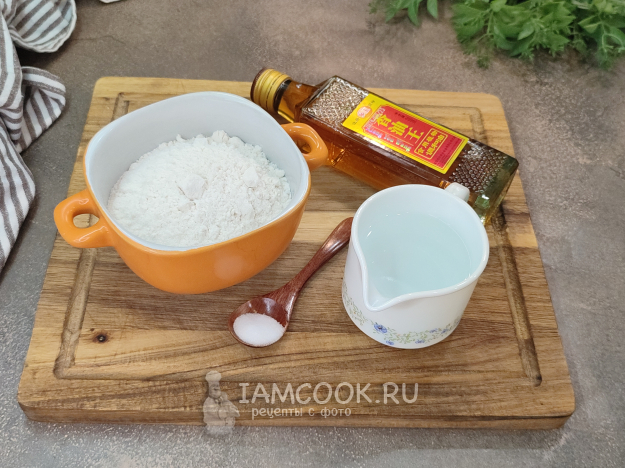 В миску всыпьте рисовую муку, соль, влейте кипяток.