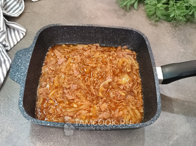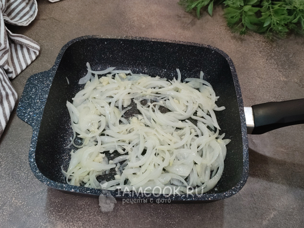 А тем временем готовим соус. В сковороде разогрейте масло, обжарьте до прозрачности лук, нарезанный соломкой, и измельченный чеснок.