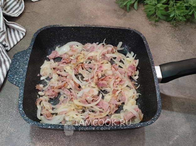 Добавьте бекон, обжарьте минуты 2-3.