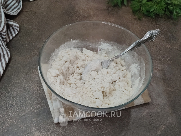 Затем руками соберите тесто в комочек. Если вам покажется, что тесто сухое и не собирается в один ком, плесните 2-3 столовых ложки кипятка в миску, продолжайте замес, пока не получится один однородный комочек теста.