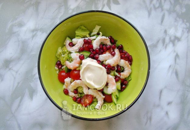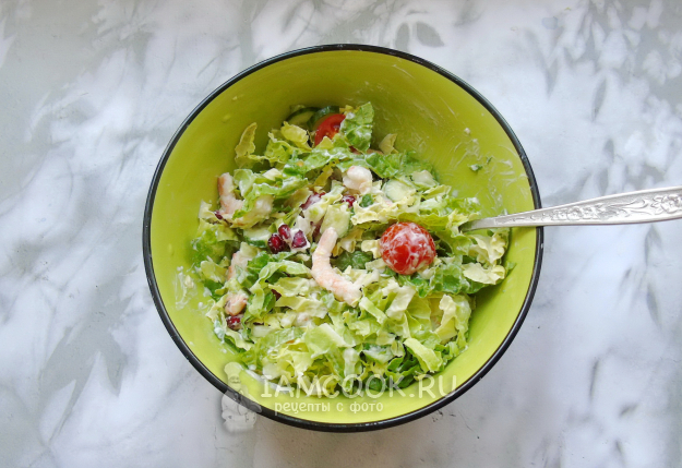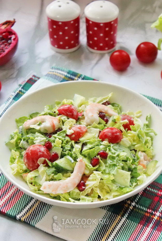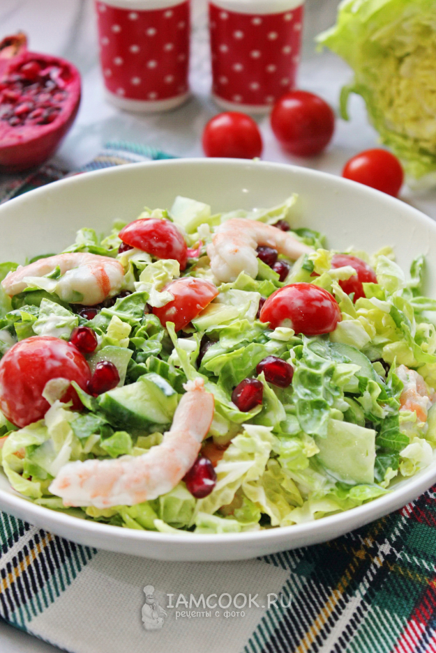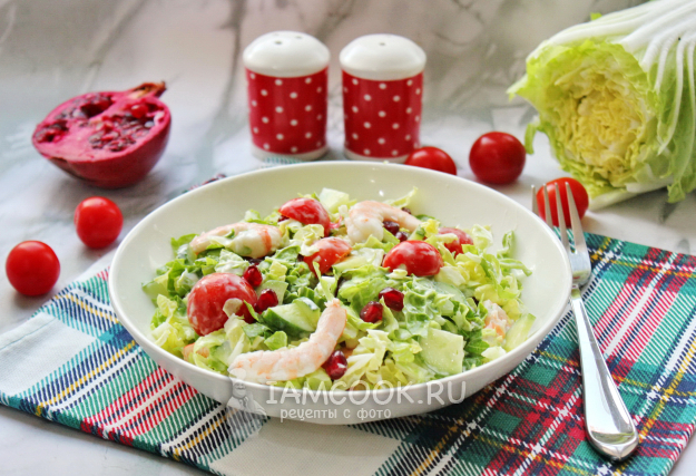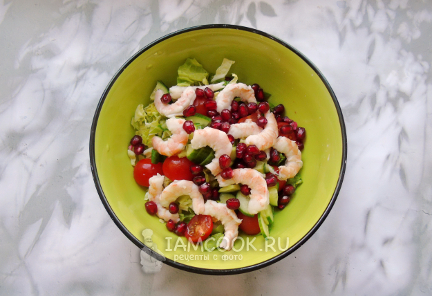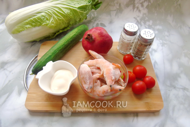 Соберите ингредиенты для приготовления салата с креветками, гранатом и пекинской капустой.