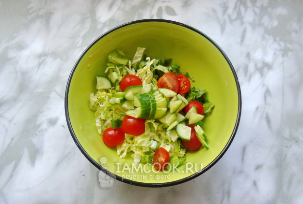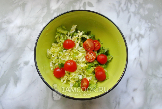 Пекинскую капусту нарежьте соломкой, а помидоры черри - половинками. Выложите в салатник.