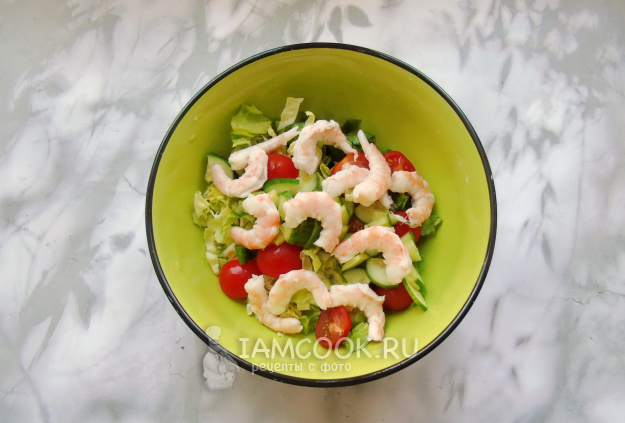 Варено-мороженые креветки залейте на 10 минут кипятком. После промойте, очистите от головы, панциря и кишечной вены. Добавьте в салат.